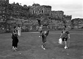 UK. Wales. General. Family play miniature golf in the grounds of Beaumaris Castle, North Wales.