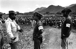 SUDAN. Chukudum. Maj. KAMAL (center) of the Sudanese army and Cap. Avelino ANGANYA, a rebel Anya-Nya officer (right), both members of the Cease Fire Commission in a camp, near the Ugandan border, where the rebels have regrouped after cease fire with the Sudanese Government. The Anya-Nya is a serpent whose poison kills instantaneously. 1972.
