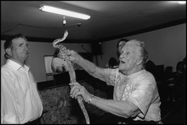 Under the watchful gaze of Pastor Bill Sommerford, an old woman handles a poisonous rattlesnake during church service. The Old Rock Holy Church gives a literal interpretation of the verses Marc 16.15-18: "And these signs shall follow them that believe; In my name shall they cast out devils; they shall speak with tongues; they shall take up serpents; and if they drink any deadly thing, it shall not hurt them; they shall lay hands on the sick, and they shall recover !"