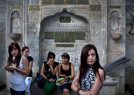 TURKEY. Istanbul. Galata Tower, Girls watching a fashion show in front of a 16th century Ottoman fountain.