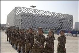 CHINA. Shanghai. Chinese PLA soldiers parade past the French Pavilion for the World Expo 2010 in the Expo site. 26 March 2010.