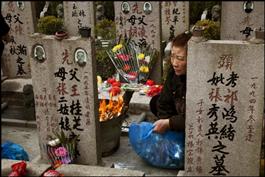 CHINA. Shanghai. A Chinese woman squats amid tombs to mourn her...