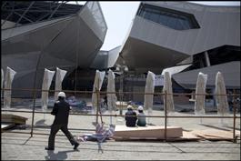 CHINA. Shanghai. Workers are seen in front of the German Pavilion for the World Expo 2010 in the Expo site. 26 March 2010.