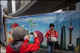 CHINA. Shanghai. Tourists take photos in front a banner for the World Expo 2010 under a ring footbridge in the Lujiazui Financial District in Pudong. 25 March 2010.