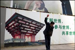 CHINA. Shanghai. A Chinese vendor throws a venting ball onto the ground in front of a banner for the World Expo 2010 with the China Pavilion on the Nanjing Road shopping street in Shanghai, China, 28 March 2010. The venting ball is used to release stress of throwers. The ball, in different shapes, is deformed by pressure after it is throwed hard onto the ground but it will recover soon for the next throw.
