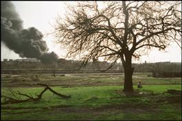 RUSSIA. Grozny, Chechnya. 03/2002. Burning Oil Raffinery at the outskirst of town. Russian soldiers at a nearby checkpoint target pratice at the abandonned factories.