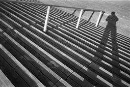 FRANCE. Paris (75013). 2001. Self-portrait shadow on stairs at the esplanade in front of the Bibliothèque Nationale François Mitterrand (National Library)..