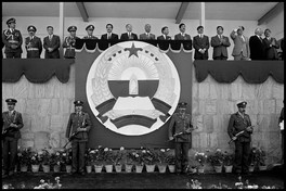 AFGHANISTAN. Kabul region. 1986. City of Kabul. General NAJIB (6th from the left), emerges as the new Secretary General and presides over the ceremonies of the 8th anniversary of the Communist coup. He is surrounded by members of the Politburo and generals.