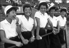 JAPAN. Tokyo. Olympic Games. 1964. National stadium. Chizuko Kimura (19) from Nikaido Highschool and some of her classmates are being trained as assistant umpires. From left to right, Hisae Watanabe, Sayoko Sugihara, Chizuko Kimura and Kazuko Tajima.