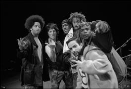 FRANCE. Ile-de-France region. Val-de-Marne department. Villejuif. "Sons d"Hiver" Jazz Festival. Romain Rolland Theater, 18 rue Eugène Varlin. In the foreground, on the right corner, French rapper SPIKE (Antagony). In the background, from left to right : US rapper Boots RILEY (The Coup), British rock musician Jeff BECK (guitar), US rapper UMI (Dead Prez), French rapper D'de KABAL (Antagony) and US rapper M-1 (Dead Prez). Rehearsal before the evening concert. URSUS MINOR with guests. Sunday, January 19th 2003.