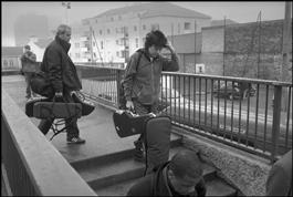 From left to right, French jazz musician François CORNELOUP (saxophones), British rock musician Jeff BECK (guitar) and in the foreground, cut, US jazz musician Jef Lee JOHNSON (guitars), on their way to the Romain Rolland Theater. Saturday 18th January, 2003.