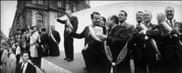 FRANCE. Paris. National Front. May Day parade (1st commemoration). Leader of the extreme right National Front Party Jean-Marie LE PEN greeting his supporters. 1988.