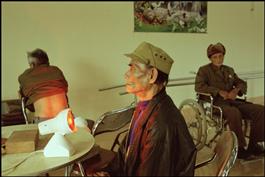 VIETNAM. January 2005. Friendship village, near Hanoi. The Friendship village is funded by international veterans associations and dedicated to Agent Orange victims. Vietnamese war veterans affected by Agent Orange in the excercice room. Vietnamese traditional medecine: red light bath for the throat and back massage.