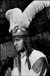 IRAN. Ghazvin. In the garden of a private home, an amateur actor of the Hajji Zamani group acts as a follower of Hussein about to be martyred in Karbala. The "taaziyeh", the passion play, portrays the martyrdom of Imam Hussein, son of Ali, founder of the Shia sect. 2005.