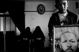 Samir Hosni Abu Sand's son holds his father's portrait. He was killed during an IDF incursion in Rafah.