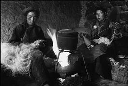 TIBET. Xigaze, about 300 kilometers west of Lhasa, in the Himalaya Mountains. 2002. A couple working while preparing their meal.