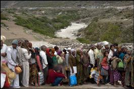 INDIA. 2. Uttarakhand. Badrinath, one of the sources of the Ganges. Pilgrims line up for hours for access to the main temple. Some carry offerings for the Hindu gods inside.