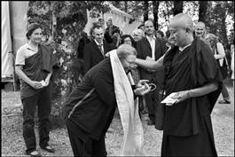 FRANCE. Dordogne. Le Moustier village. Tibetan Buddhist master DZONGAR Khyentse Rinpoche of the Nyingmapa sect, teaches at the Tashi Palbar Ling temple of the Chanteloube association in La Sonnerie. A traditional taka (white silk scarf) is offered to the Rinpoche who then gives it back to the devotee.