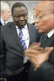 Cocktail for business and political leaders. Morgan Tsvangirai, Prime Minister of Zimbabwe, listening to Jacob Zuma.