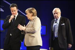 David Cameron speaks with Angela Merkel as Peter Sutherland walks by.
