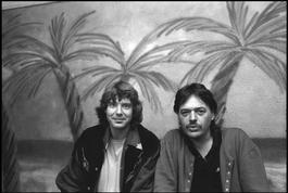 FRANCE. Ile-de-France region. Paris. 10th arrondissement, 7-9 rue des Petites Ecuries. Jazz club "New Morning". "Vive Uzeste Musical" week. French jazz musician Bernard LUBAT (piano, synthesizer, accordion, drums). Backstage, after the concert, posed photography. LA COMPAGNIE LUBAT ET DIDIER LOCKWOOD. Wednesday, May 6th 1987.