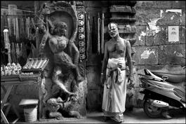 INDIA. 4. Andhra Pradesh State. Tirumali. The KAPILESWARA SWAMI Hindu temple. A pundit stands next to the statue of a dancing aspara (a courtesan) and a motorcycle.