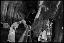 INDIA. 4. Tamil Nadu State. Tiruchirapalli (Trichy). Sri RANGANATHA SWAMY Hindu temple. The temple elephant blesses a pilgrim with his trunk after receiving a cash donation. The plgrim has offered her hair to a resident deity and her shaved head is covered by tumeric paste for protection.