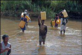 Africa. Mozambique. Mecuburi. People carry their jerry cans down to the river used for drinking water as well as for washing clothes. 2012