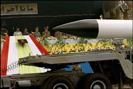 IRAN. Tehran. President Mahmoud AHMADINEJAD, surrounded by the top brass of the Iranian forces, watches a parade of home-made missiles during Army Day on April 18.