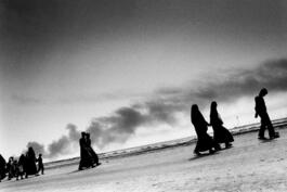 Civilians fleeing Basra during intense fighting between coalition forces and Saddam fedayin. Iraq. 2003