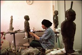 Bita FAYYAZI, a young woman artist, at work in her studio, over a series of sculptures of lifesize newly born babies.