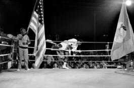 ZAIRE. Kinshasa. ALI-FOREMAN Boxing Fight. Muhammad ALI climbs on the ring between the American and the Zairian flags displayed before the fight. 1974.