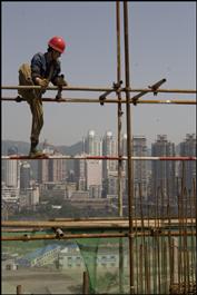 CHINA. Chongqing. May 2007. Migrant workers (mingong) on the construction of the "Cite des sciences et Techniques" by the French Architecture Studio in Shanghai. Most of them comes from poor villages of Sichuan province.
