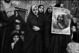 IRAQ. Baghdad. At the shrine of al-QASEMIYA, Shia women, wearing the islamic veil, show a picture of Imam HUSSEIN, during the celebrations which lead to Aarbayine. This ritual ends the month of Ashura when Imam HUSSEIN was killed in a war of succession at the dawn of Islam.
