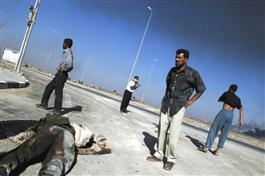 IRAQ. Basra. 04/03/2003. British forces made further advances on Basra, taking a strategic target, the Basra technical institute, right on the southern edge of the city, previously to taking this position, pro Saddam militia had used it to fire RPG's and mortar rounds at the british forces. Today after this battle, the corpse of several dead pro Sadddam militia forces have been found laying next to the school with RPgG rocket launchers strewn around them. At one point during the day several peolple came to recover the body of the dead soldiers. An elder woman was present and one could assume from her emotion that she was a relative of the dead man.Until now there have been frequent artillery exchanges between the British and the pro Saddam militia. The pro Saddam militia have used mounted artillery pieces on mobile trucks firing from civilian neighbourhoods. This has seriously impeded the British advances as they would be obliged to level whole neighbourhoods in order to take out the enemy artillery; and the British have not been willing to risk such large casualties to civilians in order to accomplish thier mission.