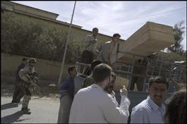 IRAQ, Mosul, 04/12/03. One day after the contested (between Kurds and Arabs) oil rich city in the North of Iraq was abandonned by Iraqi troops and partly taken over by Kurdish fighters, Peshmergas and US troops made an effort to control the city under extreme difficulties. US troops repeatedly came under fire and the majority of the Arab population reacted with anger at the arrival of the Peshmergas and US. On day two lawlessness continued, armed mobs roamed the streets. The US has only secured the airport. At the main hospital dozen of wounded, mostly Arabs are brought in and several killed, as they say by Kurds. Later Arab, Khaldean Christian, and Kurdish community and tribal leaders are addressed by and meet the US commander xxx name later at the airport controlled by US and Peshmerga, "to avoid further ethnic violence". More US troops arrive. Peshmergas are in parts of the city.