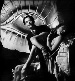 Spanish painter Salvador DALI and a model with his painted backdrop for a ballet. 1949.