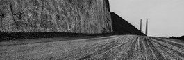 BELGIUM. Hermalle. 1998. Quarry trail "Boulade" with, on the left-hand side, a limestone slope left as to retain the natural schist. Sand stock 0/2mm and further away 2 chimneys of the battery of the rotary kilns 1, 2 and 3.