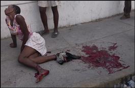 HAITI. Port-au-Prince. 02/2004. Woman injured when a looting "Chimere" drove into a crowd.