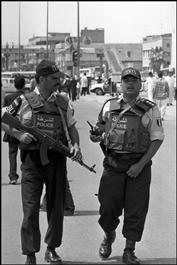 IRAQ. Al-Basrah. 2004. Two Iraqi policemen, fully armed and wearing body armour on patrol in the city.