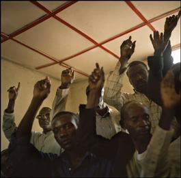 Nyamata. A newly created association brings together survivors and former prisoners (assassins). The purpose of the association is to promote reconciliation. Here, the killers identify themselves by raising their hands.