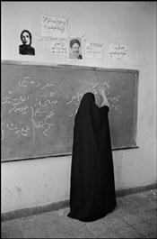 IRAN. Tehran. Darvazh Ghar, a very poor neighborhood, after the victory of the KHOMEINY revolution. Summer 1979. A teacher in chador writes on the blackboard, under a portrait of Ruhollah KHOMEINY.