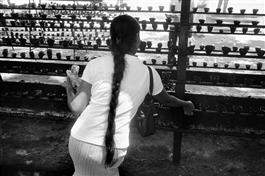 SRI LANKA. Anuradhapura. The Bodhi Tree Temple is believed to house an offshoot of the tree under which the Buddha had his revelation. A pilgrim lights oil lamps.