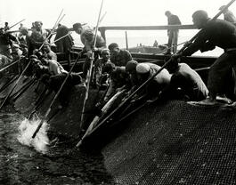 ITALY. Favignana, near Sicily. 1951. Eight Fishermen are busy with pulling one fish at a time up to the surface.