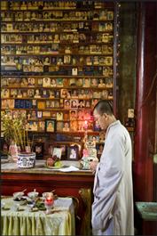 VIETNAM. Saigon. QUOC TU pagoda. Buddha is venerated here as well as Chinese deities. A Buddhist monk of the Mahayana sect performs a ritual for the spirit of a deceased. On the wall are photos of dead people.