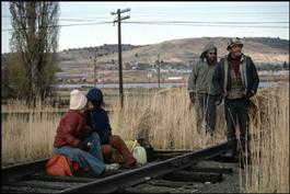 USA. Northwest coast. Russell and Raelean, a young couple from Bend OR, hoping to get to jobs in Tulsa by freight train. 1981.