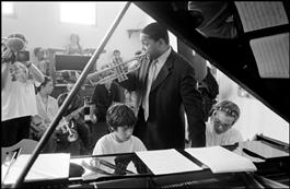 Thursday, August 8th, 2002. Marciac high school. In the middle, standing, American jazz musician Wynton MARSALIS (trumpet), leading a master class.