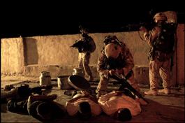 IRAQ. Tikrit. July, 2003. US troops conducting a raid and arresting suspected anti-US militants in a village. Tikrit, 80km north of Baghdad, is Saddam Hussein's hometown and a stronghold of anti-US resistance. As part of the military Operation "Ivy Serpent" in the larger Tikrit area, US Forces have set up checkpoints and conducted raids in houses thought to be giving refuge to anti-US militants.