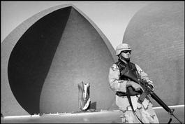 Baghdad. An armed US officer stands guard at the monument celebrating the war against Iran in the 80's.