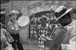 FRANCE. Brittany. Cote d Armor department. Glomel. 10eme Rencontre internationale de la clarinette populaire (10th International Meeting of Popular Clarinet/10ved Gouel etrevroadel an Dreujenn-Gaol) taking place in Pouallouen, Finistere department on 21st May and in Glomel, Cotes d Armor department on 22nd-24th May.After lunch animations by group Malagasy group Bemiray in front of restaurant Auberge de la Cascade, 5 La Grande Rue. On the left, French musician Dominique Jouve (clarinet), on the right, members of Malagasy group Bemiray, and in the background, a member of Greek group Domnia Samiou. Friday 22nd May, 1998.